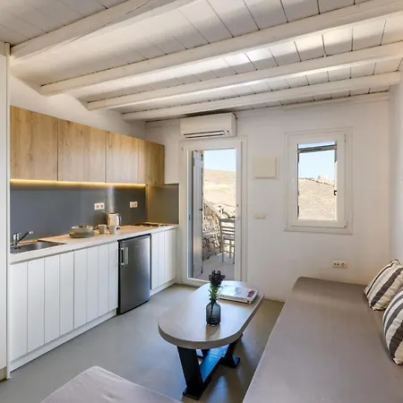 Eine komplette Küche ist mit einem Kühlschrank und einem Toaster ausgestattet, damit Sie selbst kochen können. Die Unterkünfte ist 20 Autominuten vom Flughafen Mykonos entfernt.